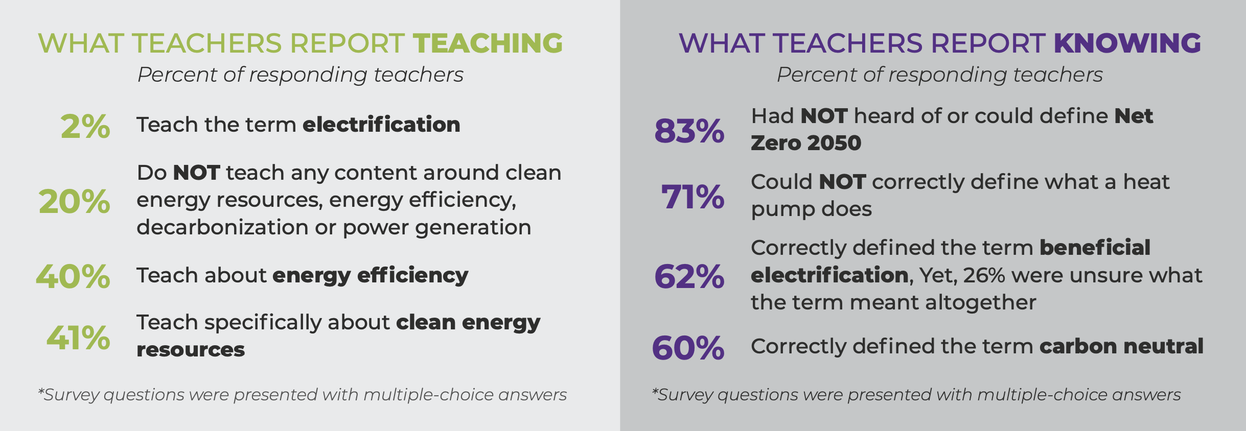 To dig under this knowledge gap, NTC surveyed its Professional Educator Network (PEN) cohort to gather additional data on what teachers know and teach about clean energy resources and the energy transition. The PEN cohort is a group of almost 5,000 educators from across the country who have participated in NTC school programs and have opted in to provide ongoing feedback. 144 teachers completed the survey, providing 3,004 years of collective teaching experience that shed light on the stark contrast between utilities’ assumptions about the general public’s energy literacy toward the future and what is actually in practice today.