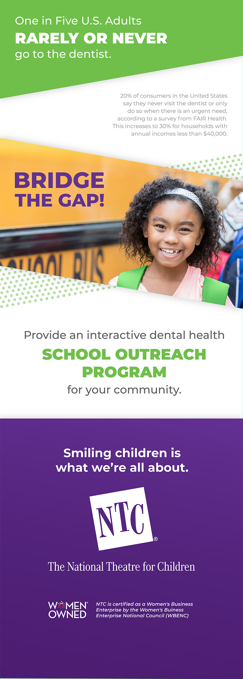 When the audience of school-age children watch Land of Smiles, they are not excited and engaged because they are learning how to properly brush and floss their teeth. They are engaged by the characters, plot, humor, costumes, props, and dialogue that is woven into the story that is unfolding in front of them. But, funny enough, they also learn the importance of good oral health and how to properly brush and floss their teeth. They also remember those things longer than if they were just told those same things in a lecture. In fact, as already stated, 22 times more. All with very little effort on their part.